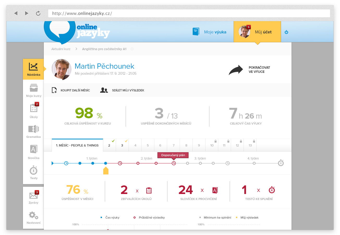 Každý měsíc si uděláte rekapitulační test. Na konci kurzu vás pak čeká velký test a celkové měsíční opakování. Zhodnoťte průběh vašeho studia, pochvalte se a odměňte za dobře odvedenou práci. Budete chtít pokračovat.
